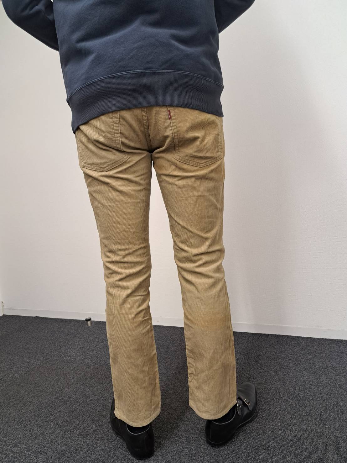 定番の505のコーデュロイパンツです。テーパードラインが綺麗ですので革靴との相性もバッチリです。流行りのデニムジャケットと合わせてみてはいかがでしょうか。